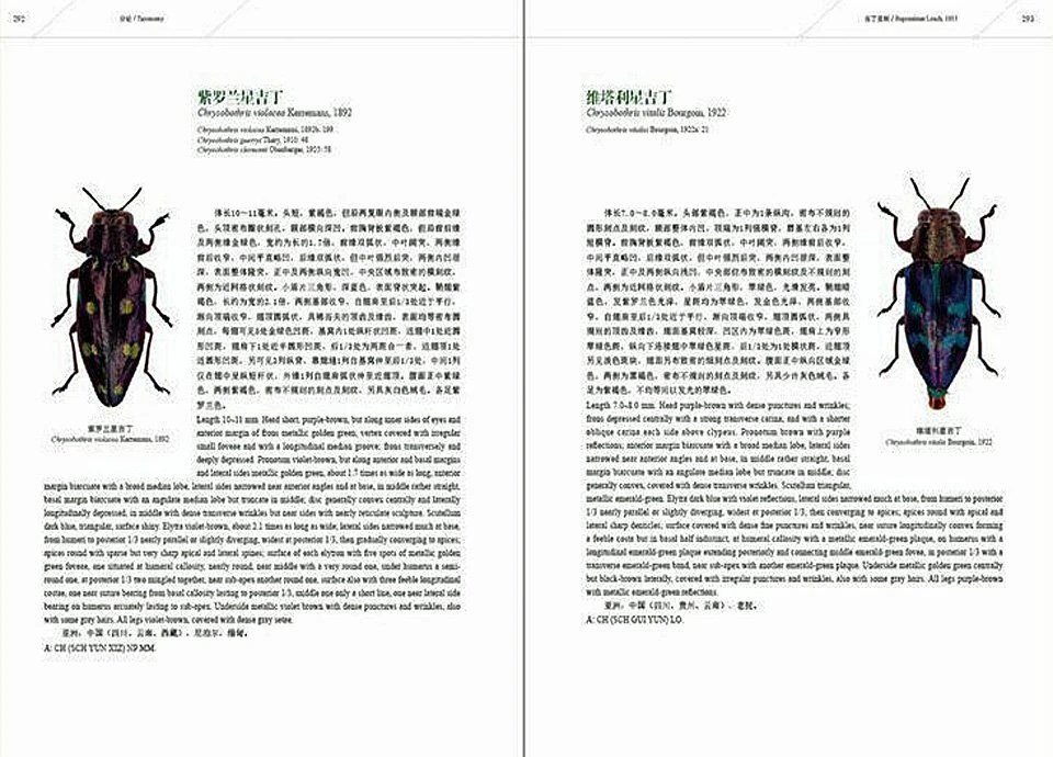 This two-volume set includes two major sections: the general section which introduces basic knowledge on Chinese jewel beetles (Buprestidae) and morphological characters for taxonomy, and a taxonomic section where the 745 species and subspecies from China and other relevant taxa involved are diagnosed, of which 22 important species from adjacent regions are also included for research convenience. All species diagnoses are written in both English and Chinese. The book presents 846 colour photographs, including 97 morphological photographs and 749 species images (of which 349 are type specimens). Most chapters of the book has been peer-reviewed before publication. In order to facilitate reading, the layout style is basically one image and concise description per page including a necessary synonym table.