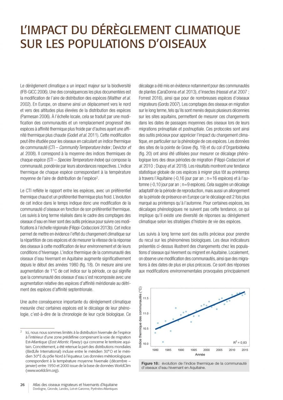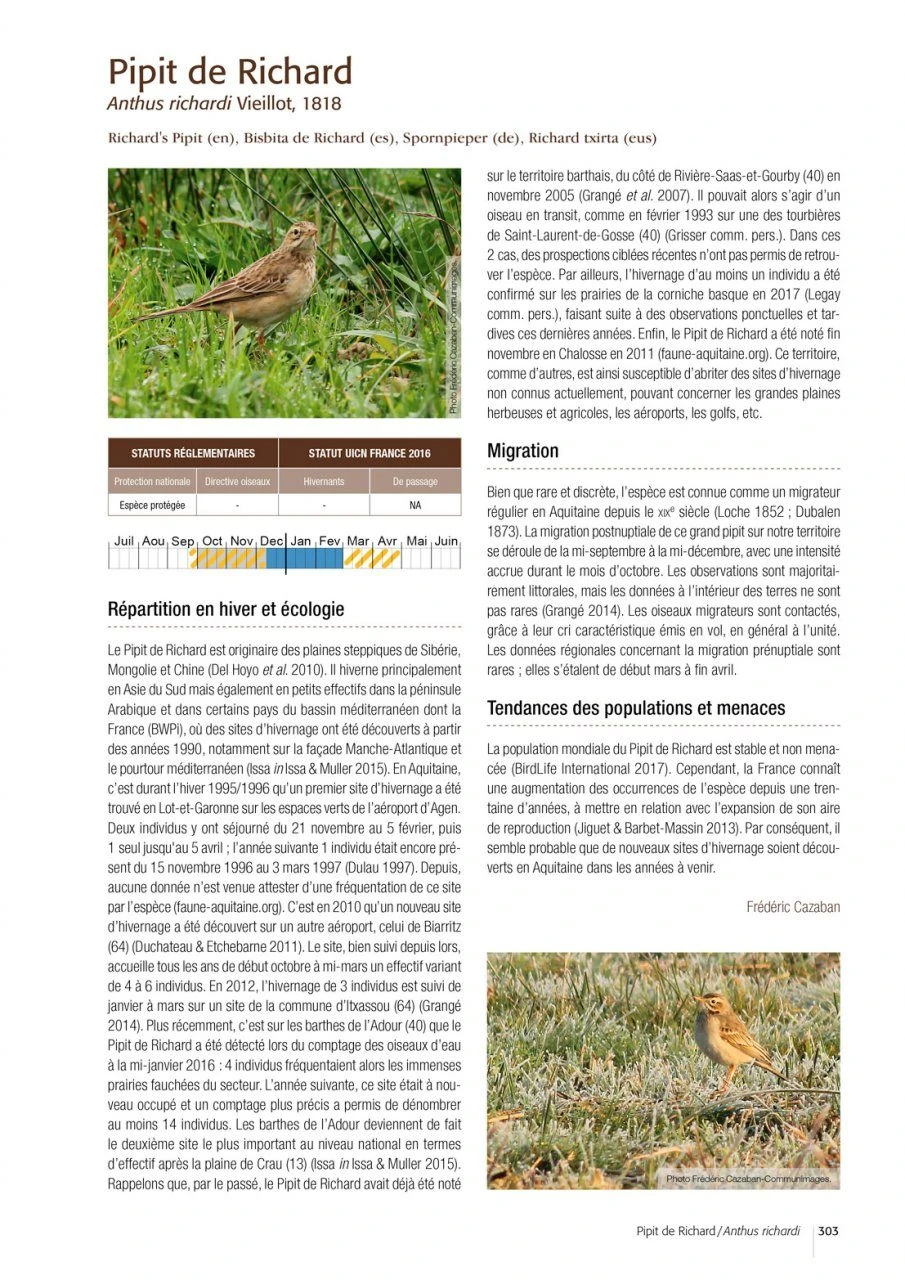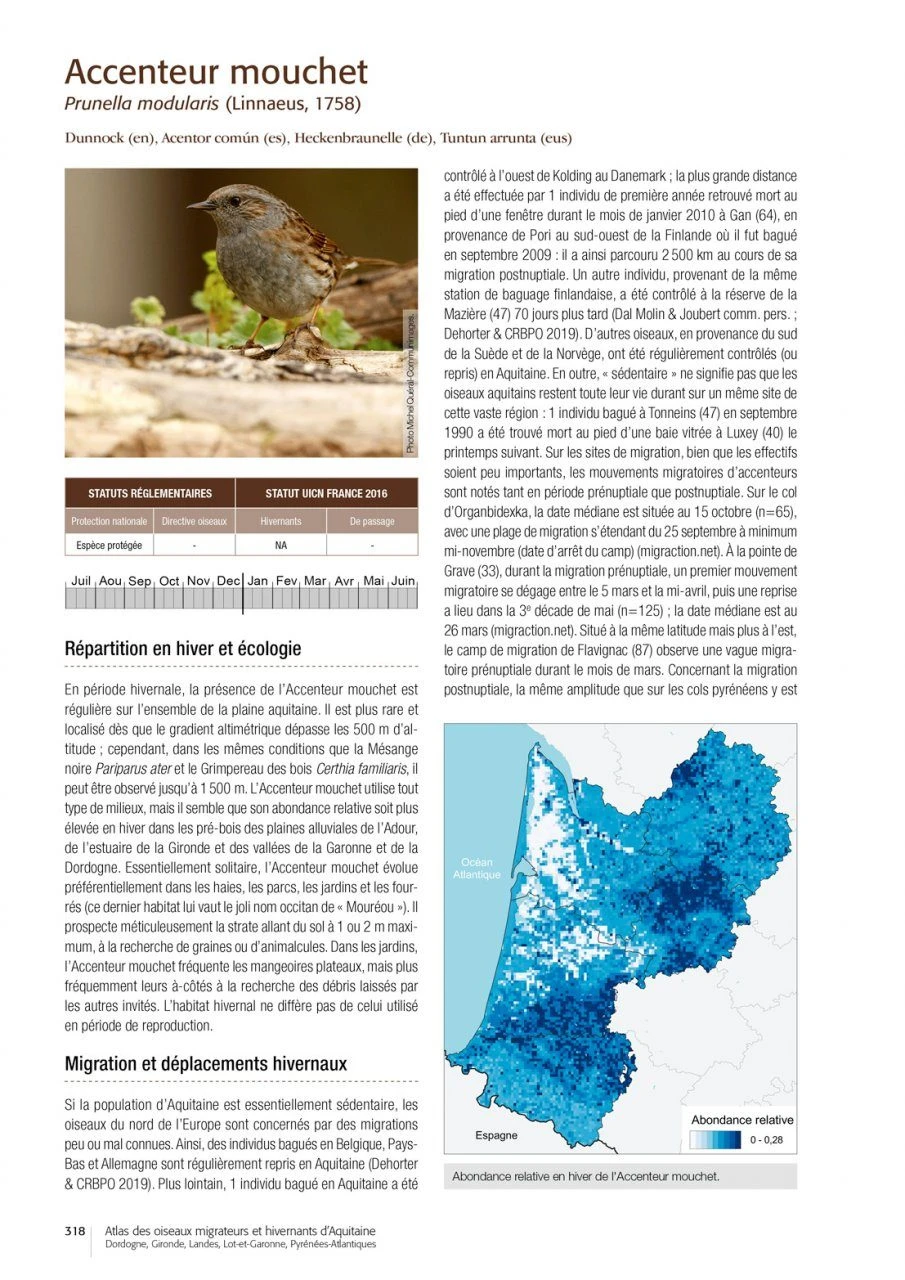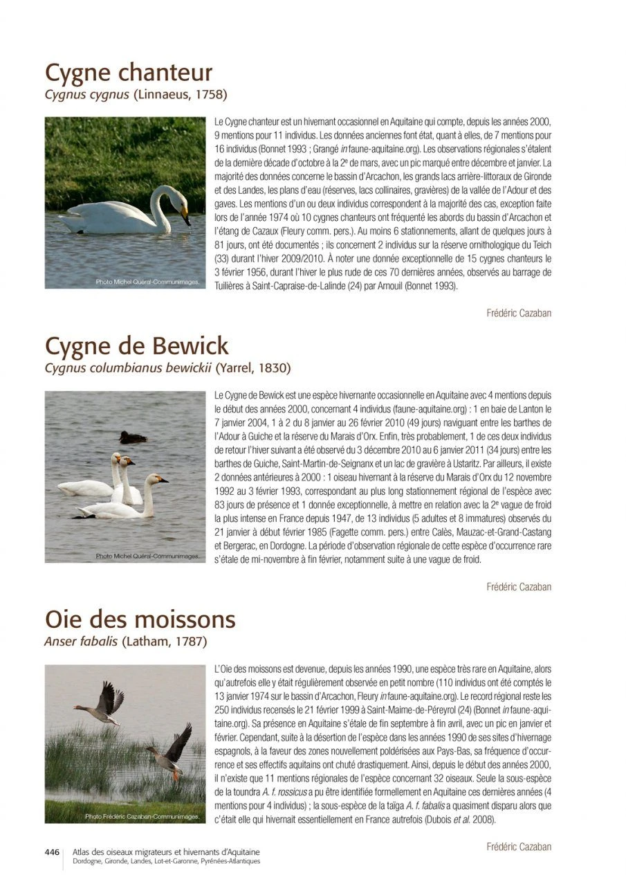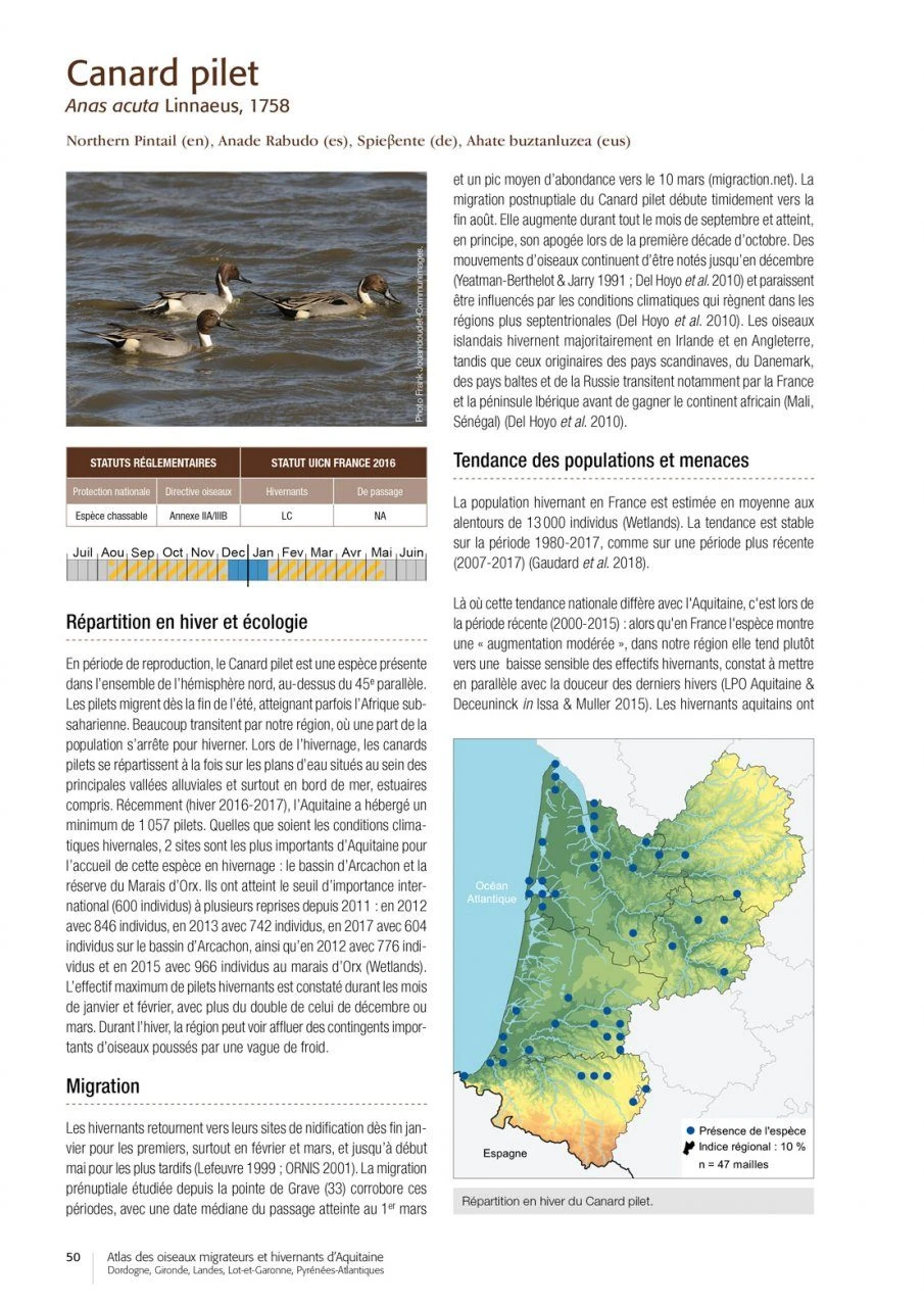 After the publication of the in 2015, here is an unprecedented regional summary on the populations of wintering and migrating birds of Aquitaine in southwestern France. This work is based on five years of field surveys on birds in winter throughout the region, 40 years of migration monitoring in the Basque Country and on the Atlantic coast, and the coordination of wetland counts under the banner “Oiseaux d’eau à la mi-janvier” made since 1967.