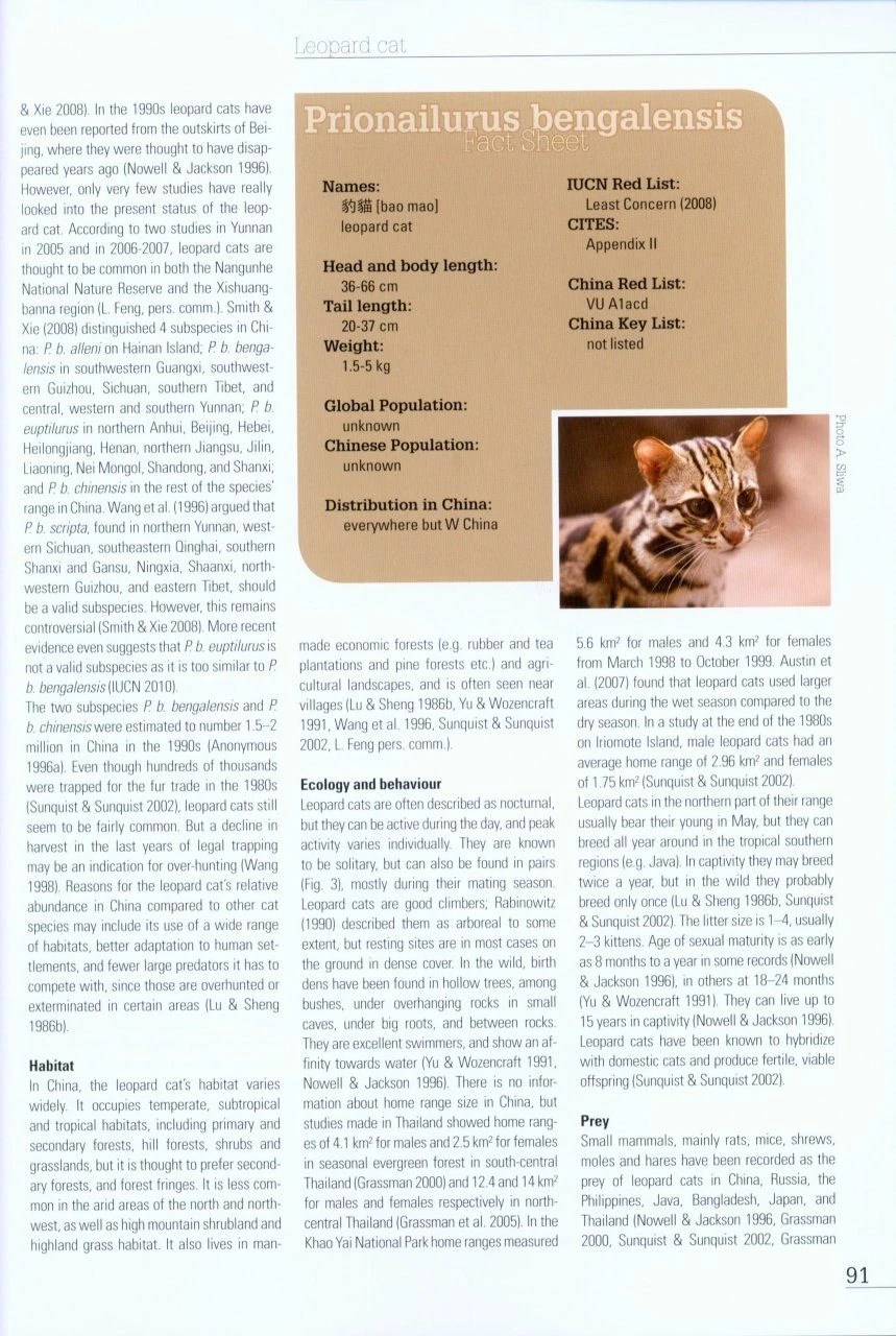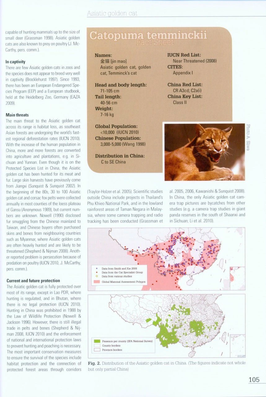 China is home to 13 species of feline, nearly one-third of all extant species. The IUCN Species Survival Commission Cat Specialist Group edited Cats in China to provide background information on all 13 felines, including distribution area and population size trends, and to update, summarize and improve the relevant information.