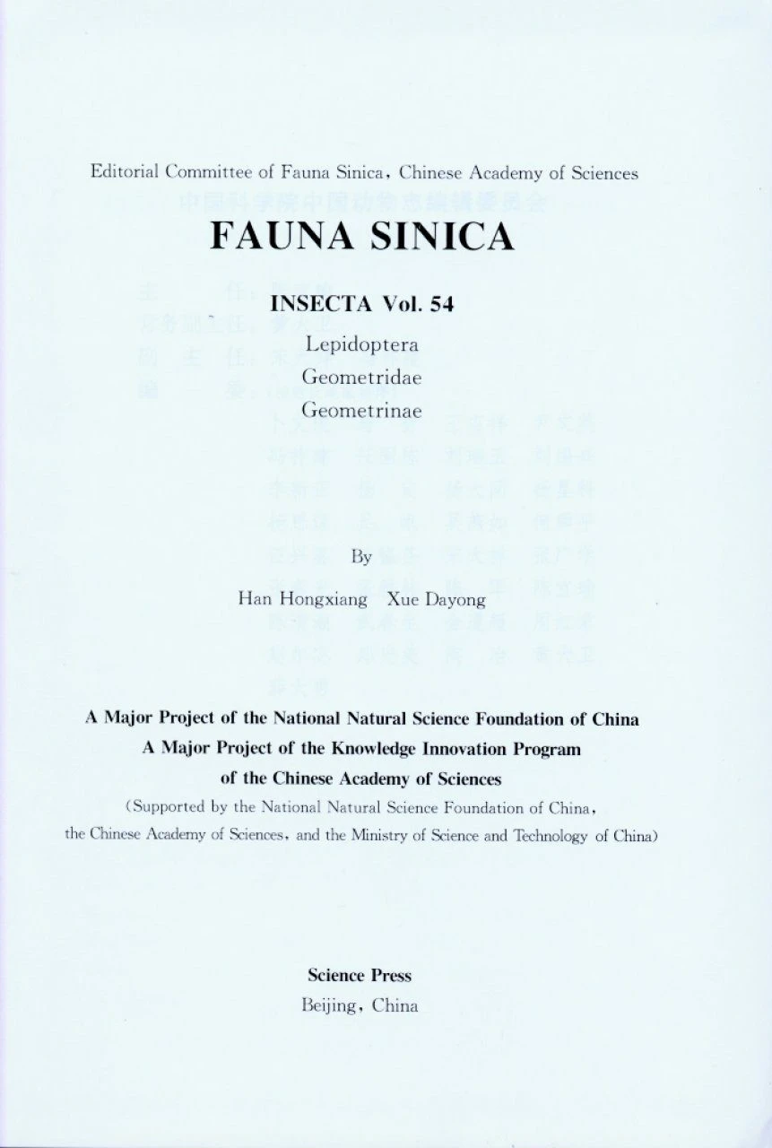 This volume of Fauna Sinica deals with the systematics and fauna of Geometrinae from China, which encompasses both the Palaearctic and Oriental regions. The whole work includes two parts: introductory section and systematics. In the introductory section, comments on the taxonomic history of the Geometrinae are summarized. The different classifications on tribal level on the basis of different regions are introduced and compared, and the genera distributed in China are separated into different tribes. Taxonomic characters of the subfamily are listed and their taxonomic significance is discussed. Biological information, especially host-plant relationships, is listed and analysed. Zoogeographical patterns of Geometrinae are discussed and the results show that most Geometrinae genera are distributed in tropical areas, and African and Oriental regions are the centers of distribution and diversification.