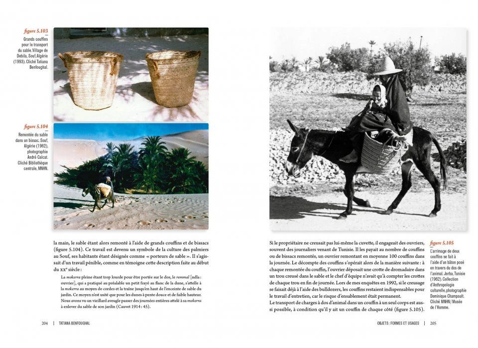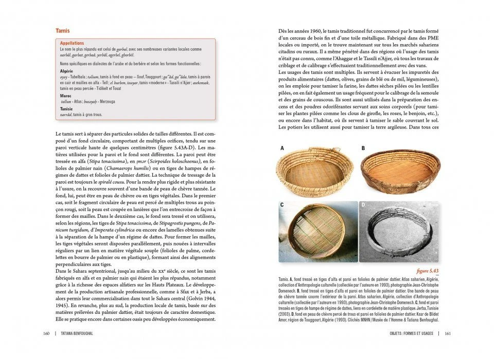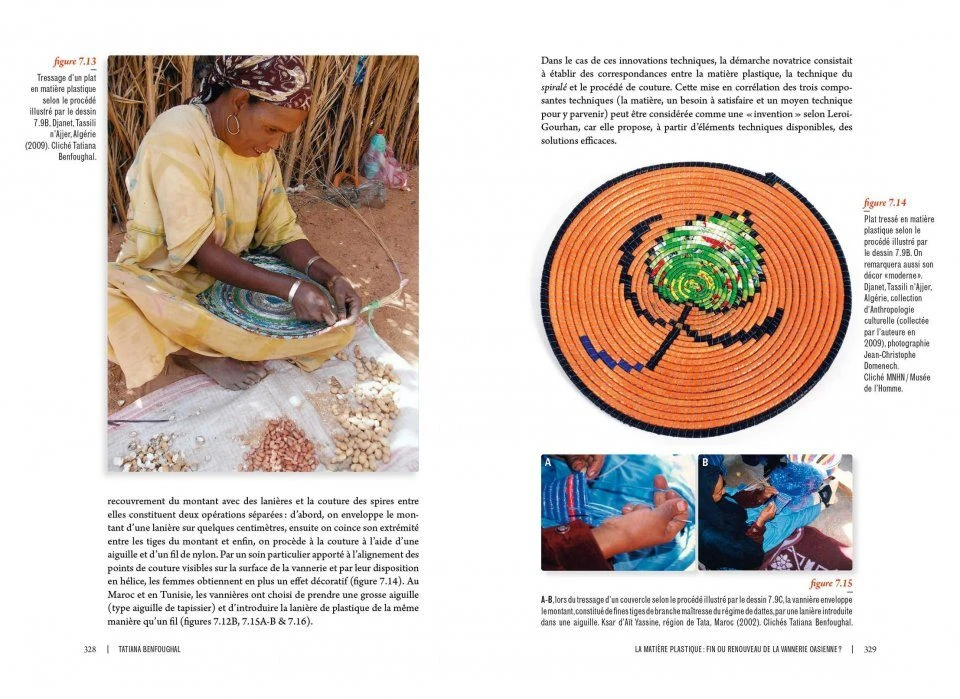 This work is the result of research led by Tatiana Benfoughal in the Saharan oases of the three Maghreb countries: Morocco, Algeria and Tunisia. In order to investigate basketry craft and all its connections to environment and society, the author takes on three different directions of approach. Based on the use of fibres extracted from the palm tree, basket-making is first considered as an element of the oasitic agrosystem, assimilated into a more global Saharan system characterized by two complementary ways of life, nomadic and sedentary. Then, in an exploration of the objects of basketry making, on par with the most, painstaking museography Tatiana Benfoughal analyses weaving techniques, the knowledge and know-how that are linked to them, as well as the ways weavers, men and women, value what is “beautiful” and what is “modern”. In the same section, the description of the different uses of basketworks invites the reader into the daily and festive life of the oases’ inhabitants. Finally, in the third approach, the author proposes an analysis of the status of men and women basket weavers within the oases society, of their working conditions and the means of marketing their products. The author seeks in particular to grasp basket weaving as part of two closely connected contemporary situations: on the one hand the partial perpetuation of a former way of life and practice and, on the other, the deep restructuring of economic and sociocultural life in the Sahara.