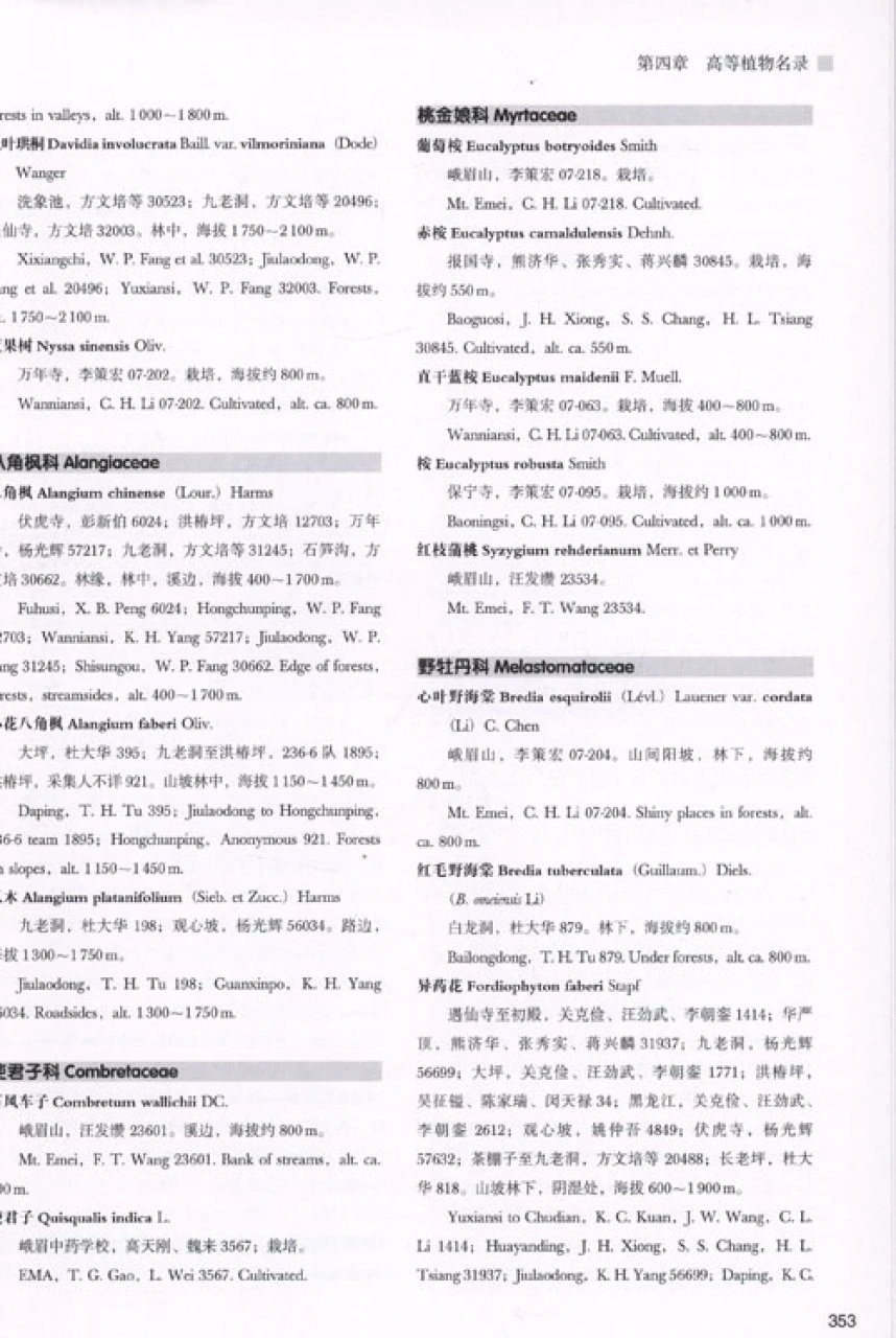This colour book includes 3703 species in 1271 genera, 280 families of higher plants of Mount Emei, which located in Sichuan province, southwest of China. Among the 3703 species, Bryophytorum are 402 species, Pteridophyta are 430 species, and Spermatophyta are 2871 species. The text is divided into four chapters.