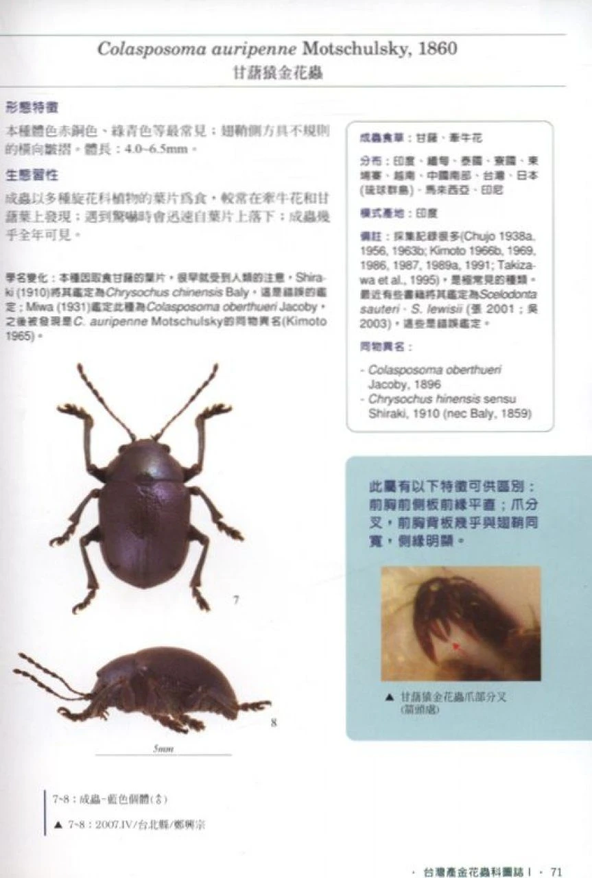 This series of books describes the morphology and biology of chrysomelids (i.e. leaf beetles) in Taiwan. The first issue includes 100 common and special species. This issue contains more than 500 full colour plates and live photos, and is written as an in-depth identification guide and biology reference for entomologists and nature lovers.